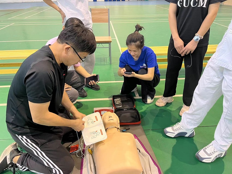 培训着重讲解了心肺复苏技能中的呼吸判断、胸外按压要点、自动体外除颤器(AED)的使用方法、急性运动损伤的止血、包扎、固定、搬运以及海姆利克手法等急救技能,培训导师还利用模拟人、AED练习机指导培训学员认真进行实操训练。此次培训活动让学员受益匪浅,大家纷纷表示学到了很多应急急救技能。