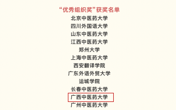 2022年11月,由中国外文局翻译院和中国外文局CATTI项目管理中心联合发布的《2022国内翻译赛事发展评估报告》显示,“时珍杯”全国中医药翻译大赛是全国医药行业三大翻译赛事之一。本次比赛的参赛选手来自全国各地,除中医药院校和医科院校外,还涵盖北京大学、清华大学、浙江大学、南京大学、新加坡南洋理工大学、香港理工大学等590多家机构。大赛评审共采用三轮淘汰机制,第一轮为初评,第二轮为复评,第三轮为终评。经过公正严密的评审和认真细致的核实,最终产生汉译英组(笔译)、英译汉组(笔译)获奖选手各20名,“ 优秀组织奖 ”12名。