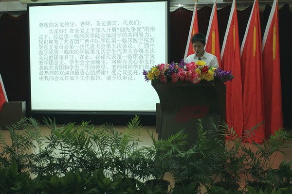 莅临本次大会的嘉宾有广西中医学院第一附属医院副院长韦艾凌博士,第一临床医学院教学党总支黄彬书记,第一附属医院团委林强书记以及教学部刘旭老师。本次大会共有正式代表63人,由低年级各团支部民主选举产生。大会在韦艾凌副院长的致辞中拉开序幕。