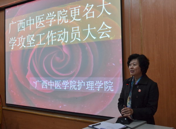 12月13日下午,广西中医学院护理学院在东葛多媒体教室召开更名大学攻坚工作动员大会,护理学院党委岑家铭书记、吴彬院长、周琦副院长、高滨洋副院长、林原副院长等领导及全体教职工参加了此次大会。
