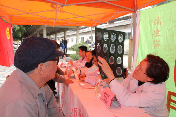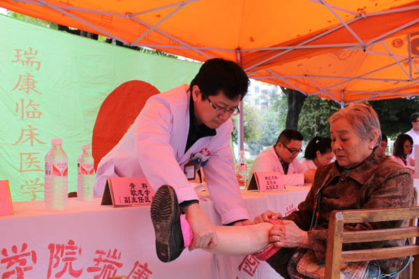 义诊现场,志愿者刚刚摆好桌椅,前来咨询和接受诊疗的社区居民便络绎不绝,志愿者通过现场解答和分发宣传手册,对常见病、多发病及高血压、糖尿病、食物中毒等疾病的预防和治疗及相关知识进行宣传,为前来问诊的居民进行测血压等基础医疗检查,瑞康医院的神经内科、骨科、心血管内科、消化内科的专家为前来咨询的居民进行了认真的接待,并且对居民提出的问题都给予认真的讲解。一位75岁的老奶奶向骨科欧志学博士诉说近年来膝关节疼痛,欧主任认真听取了病人的自诉后,贴心地为老奶奶开出了一少三多的“爱心药方”:减少过度运动、负重,多做悬空运动改善局部血供,多穿衣服注意膝关节保暖,多吃钙片或含钙量高的食物。通过一下午的服务,赢得了社区居民的赞扬。