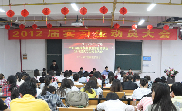 2012年4月17日晚,赛恩斯新医药学院2012届实习生动员大会在阶梯103教室举行。赛恩斯新医药学院党总支副书记兼副院长梁天坚、副院长叶绘晟、教务处处长黄红泓、学工处学生管理科副主任王海婴、实习管理科副主任黄学政、2012届实习生班级辅导员以及全体实习生参加了动员大会。