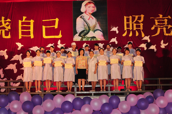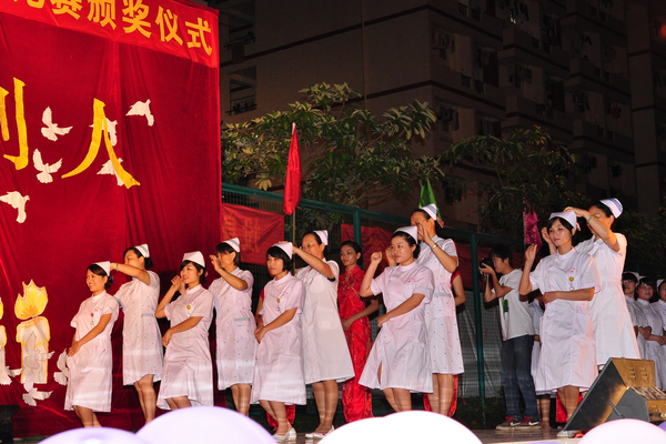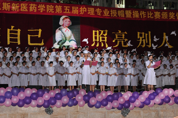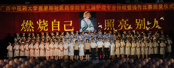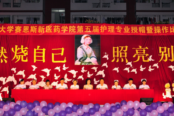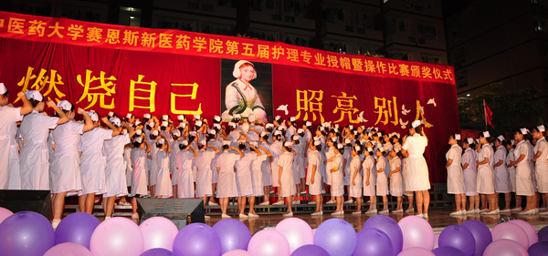 为隆重纪念“5•12国际护士节”,展示白衣天使风采,传承南丁格尔精神,2012年 5月16日晚,赛恩斯新医药学院在篮球场隆重举行第五届护理专业授帽暨技能操作大赛颁奖仪式。