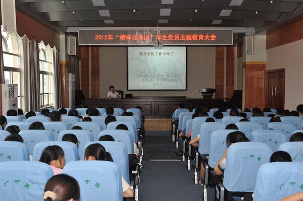 2012年6月25日是“榜样在身边”主题教育大会,会上邀请了南宁东葛社区卫生服务中心的胡善乐医师给学生党员们介绍他本人在基层工作10年的经历,分享了他成才的体会。胡善乐医师毕业于广西中医学院,毕业后放低身段,扎根基层社区,既当医生,也当勤杂工,什么脏活累活都主动干,通过自身的努力,现在在病人中拥有极高的美誉度,患者天不亮就来排队挂号,被“街坊粉丝”们誉为社区名医,其事迹被《南国早报》、《当代生活报》及广西新闻网等多家媒体所报导,并多次受到国家及自治区领导的接见。胡善乐医师的个人经历深深地教育了广大毕业生党员,使大家认识到在基层工作和发展,在基层中锻练成才一样大有可为,同时,培养对病人的同情心,锻造自己的爱心和事业心,是每一个医者必修的科目。