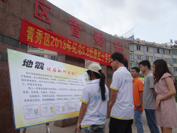 本次宣传活动围绕“贫困母亲募捐”这个大主题开展,还穿插了“预防艾滋病,健康全家人”和应急急救知识宣传两个小主题。赛院志愿者协助青秀区红十字会通过设点宣传、发放传单、海报展示等3种方式宣传。志愿者们顶着炎炎烈日,依然面带微笑着向过往的群众发放宣传资料,耐心地为前来咨询的群众讲解,同时还现场讲解演示了急救知识。
