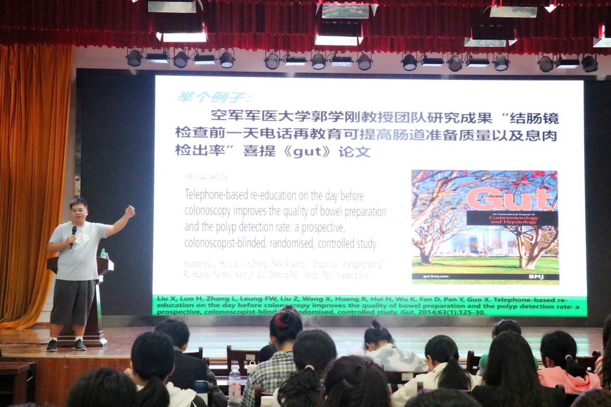 首场主讲嘉宾临床护理教研室黄振鹏博士结合自己的成长之路,以轻松、幽默的氛围详细为同学们介绍了开展医学研究的基础知识,重点讲解了科研选题的原则、方法与技巧。老师激情澎湃,同学学思并举,会场气氛活跃。