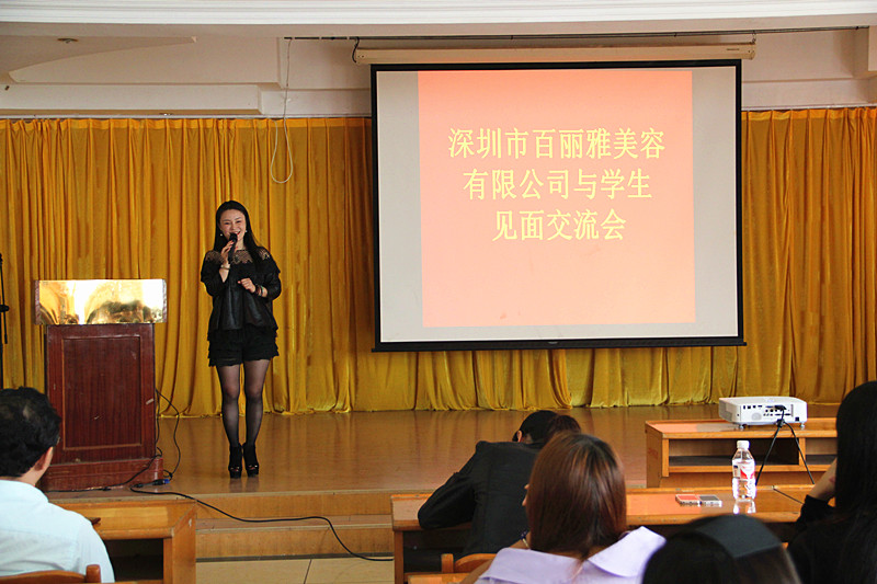 见面会于中午13点在大学生俱乐部正式开始,2012级和2013级 百丽雅订单班全体同学以及部分医疗美容技术普通班的同学参加了见面会。会议由高职处副处长、高职院副院长杨仕权主持。会上,胡海妹经理首先通过宣传短片的 形式介绍了百丽雅公司的概况和发展历程,接着叶青总经理从自身的经历切入,更深入、全面地介绍了百丽雅作为一家全国乃至全球知名的美容企业,无论是对顾客 还是员工,处处都体现“以人为本,大爱先行”的企业文化。叶总风趣幽默的演讲获得了同学们的阵阵掌声。最后,叶总二人走下讲台,与学生近距离互动交流,并 耐心地回答同学们的提问。
