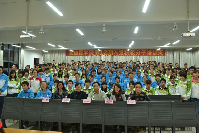 为进一步加强入党积极分子对党的基本知识的学习,提高入党积极分子的思想理论水平,端正入党动机,确保党员发展质量,为发展新党员奠定基础,基础医学院党委于2013年12月4日至8日举办了入党积极分子培训班,校党委组织部李中华部长、基础医学院党委龙春莉副书记,学办全体教师以及学生入党积极分子共250人参加了培训。
