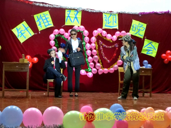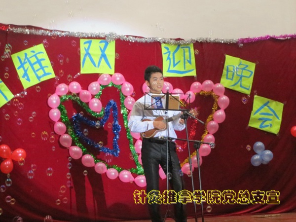“双迎晚会”意在“迎新生、迎新年”。回首2013,针灸推拿学院全体同学团结协作,努力拼搏,学生工作取得了较好的成绩,尤其是在刚刚结束的“针灸推拿理论与操作技能大赛”,针推学子力克群雄,独占全部单项冠军和团体冠军。展望2014,针灸推拿学院学子将更加勤奋努力,以昂扬的斗志,阔步向前。