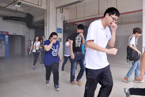 本次演练是贯彻落实《关于开展学校消防安全教育“六个一”活动的通知》精神,演练场景为课中遇到突发性火灾时的紧急撤离。演练前,赛院副院长杜惠娟出席了演练现场并作讲话,希望大家本着安全第一的原则,积极配合完成本次演练活动。随着消防支队青秀大队青秀中队消防应急疏散演练哨声响起,参演的2011级、2012级、2013级学生及辅导员,在后勤保卫处、教务处、学工处、物业公司等有关部门的引导下,按照火灾逃生的要求,用湿毛巾捂住口鼻,弯腰低行,有序地从4个消防楼道疏散撤离,疏散过程中没有出现堵塞、争先恐后、推撞踩踏的现象,全员均安全有序的撤离到了安全集结点。