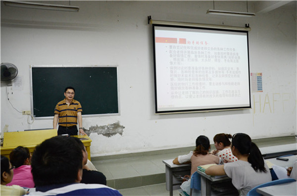 会上由黄彬主任就如何当好合格的实习医生进行了专题讲座。讲座图文并茂,密切结合临床实践和其多年来行医、管理的心得,对即将下点实习的同学提出了以下五点要求,一是要认请实习生的身份和明确自身的责任和任务;二是要树立以病人为中心的思想,处理好医患关系;三是处理好实习与考研、找工作的关系;四是培养临床思维能力,加强临床技能操作、全面提高综合素质。五是感恩教育,让同学们铭记自己的母校和老师。随后,教学党总支罗之瑜书记就学生如何文明离校,遵守实习纪律,注意安全和就业工作等方面提出了具体的要求和布置。
