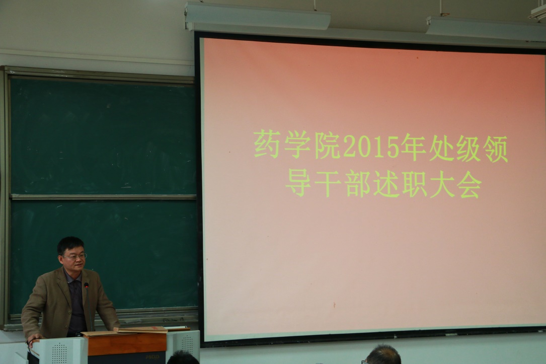 2016年1月13日,药学院在仙葫校区教学楼1-303教室召开领导班子、领导干部2015年年度考核述职述廉民主测评会,药学院全体教职工参会。学校庞宇舟副校长、统战部吴光副部长和组织部彭定基科长参会指导。药学院党委书记王勤主持会议。