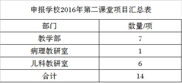 为鼓励教师参与学生第二课堂,充分调动教师参与学生第二课堂的积极性,根据学校印发的《taptap点点体育关于填报2016年度第二课堂计划的通知》文件要求,积极宣传发动,组织各教研室、各科室开展大学生第二课堂项目申报工作。截止3月15日,第一临床医学院申报了包含卓越中医师人才培养计划、泛珠比赛相关培训考核等第二课堂项目共计14项,其中申报项目部门分布情况如下:教学部7项、病理教研室1项、儿科教研室6项。
