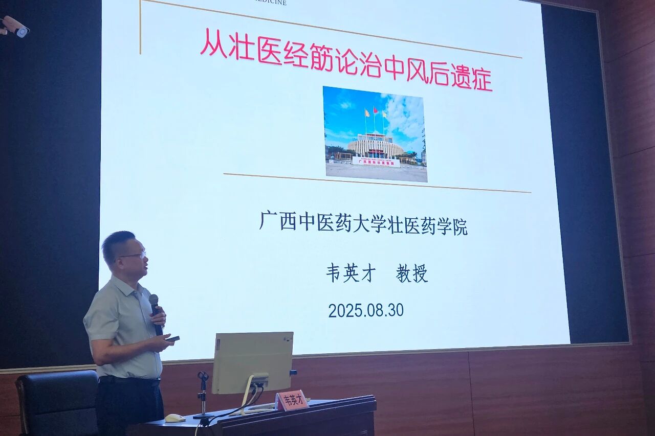 当天下午,团队组织开展学术讲座。韦英才以《从壮医经筋论治中风后遗症》为题授课,系统阐述“筋纵则瘫”理论,并结合典型病例,详解壮医经筋治疗中风后遗症的诊疗思路;副主任医师吕计宝则分享了《壮医经筋“点线面”思维诊治神经根型颈椎病》,通过“点即结筋病灶点、线为经筋线、面属疼痛面”的立体思维,展现了壮医诊疗的整体观和动态观。讲座现场互动频频,学术氛围浓厚。