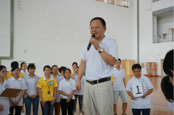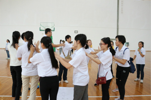 王碧艳副院长为活动开幕致辞,她对本次活动的目的以及活动的背景做了简要的介绍,强调素质拓展在提高大学生环境适应及团队合作能力等方面的重要作用。接着,欢乐激情的“小苹果”热身舞蹈后,竞争比赛性的“团队展示”、“心有千千结”、“水杯传情”、“众志成城”等素质拓展游戏陆续上演。整个活动过程,师生一起并肩作战,激情似火如骄阳,有快意也有失意,赢了爽朗大笑真臂欢呼;输了,欣然接受奋起直追。胜不骄,当拥豪情万丈,挺胸向前;败不馁,亦有万丈豪情,百折不挠。这动人的旋律,正是同学们奔跑的火热青春。