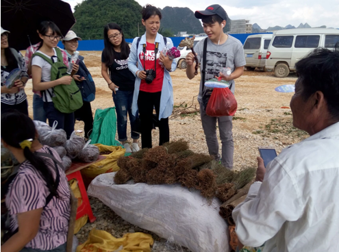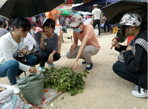 尽管天气炎热,药市人潮涌动,但仍旧不能阻止同学们对于探寻药物的热情。在带教老师的带领下,从街头走至巷尾,见识多种多样的药材,学习药物的鉴别及地方壮民对药物的特殊用法,拓宽同学们的视野,同时也使得同学们把课堂上的理论知识充分运用于实践当中。此外,同学们还对壮语表现出了极大的热情,在跟当地居民沟通的过程中也在学习壮语,他们认为语言的共性更能促进交流和理解,也更有利于对壮医的学习。