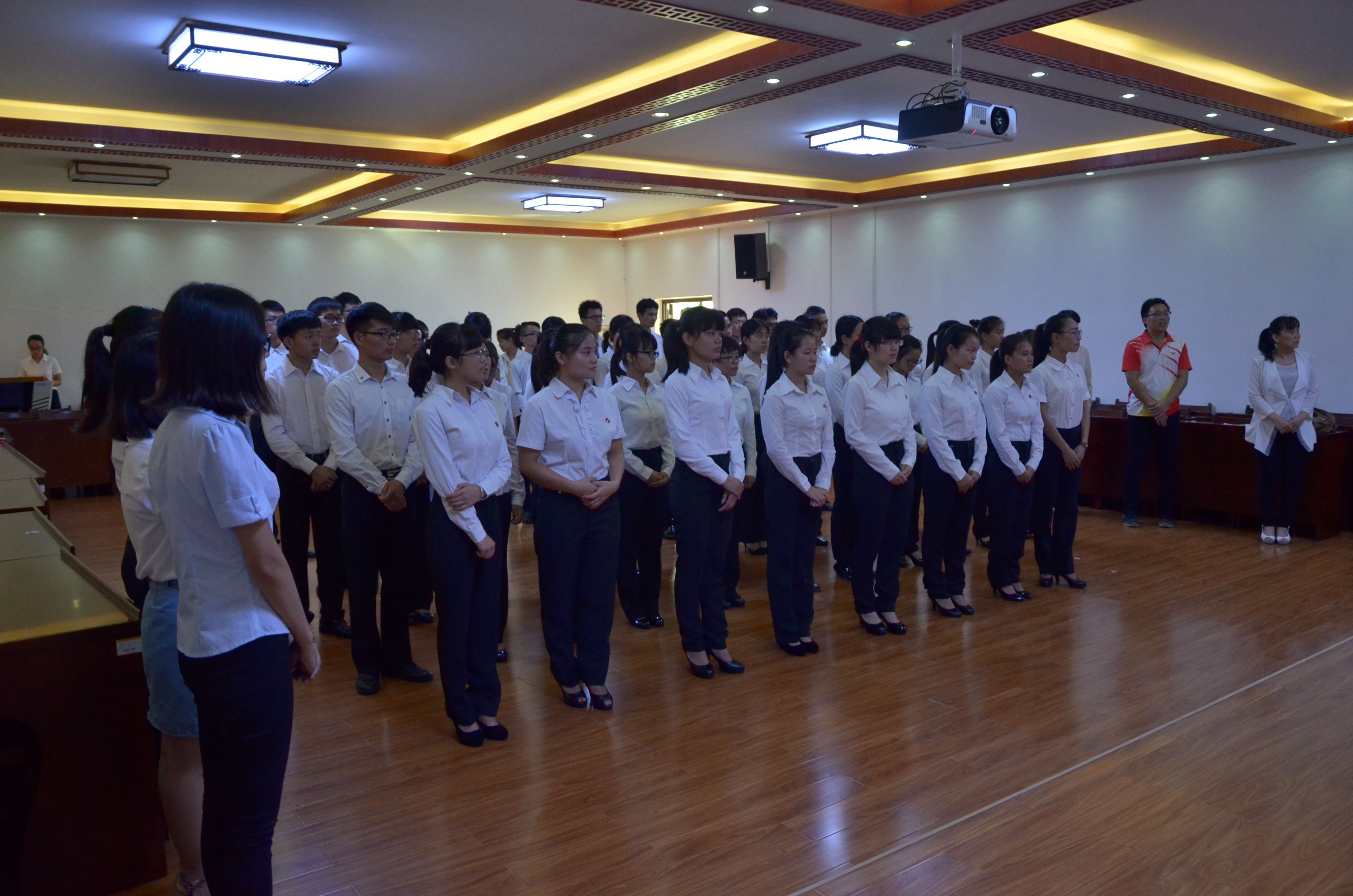 接下来主持人宣布新一批预备党员名单,希望他们今后以党员的标准严格要求自己,发挥先锋模范作用。随后,在鲜红的党旗下,杨美春带领全体党员进行入党宣誓,铿锵有力的宣誓充分显示了同志们的入党决心。