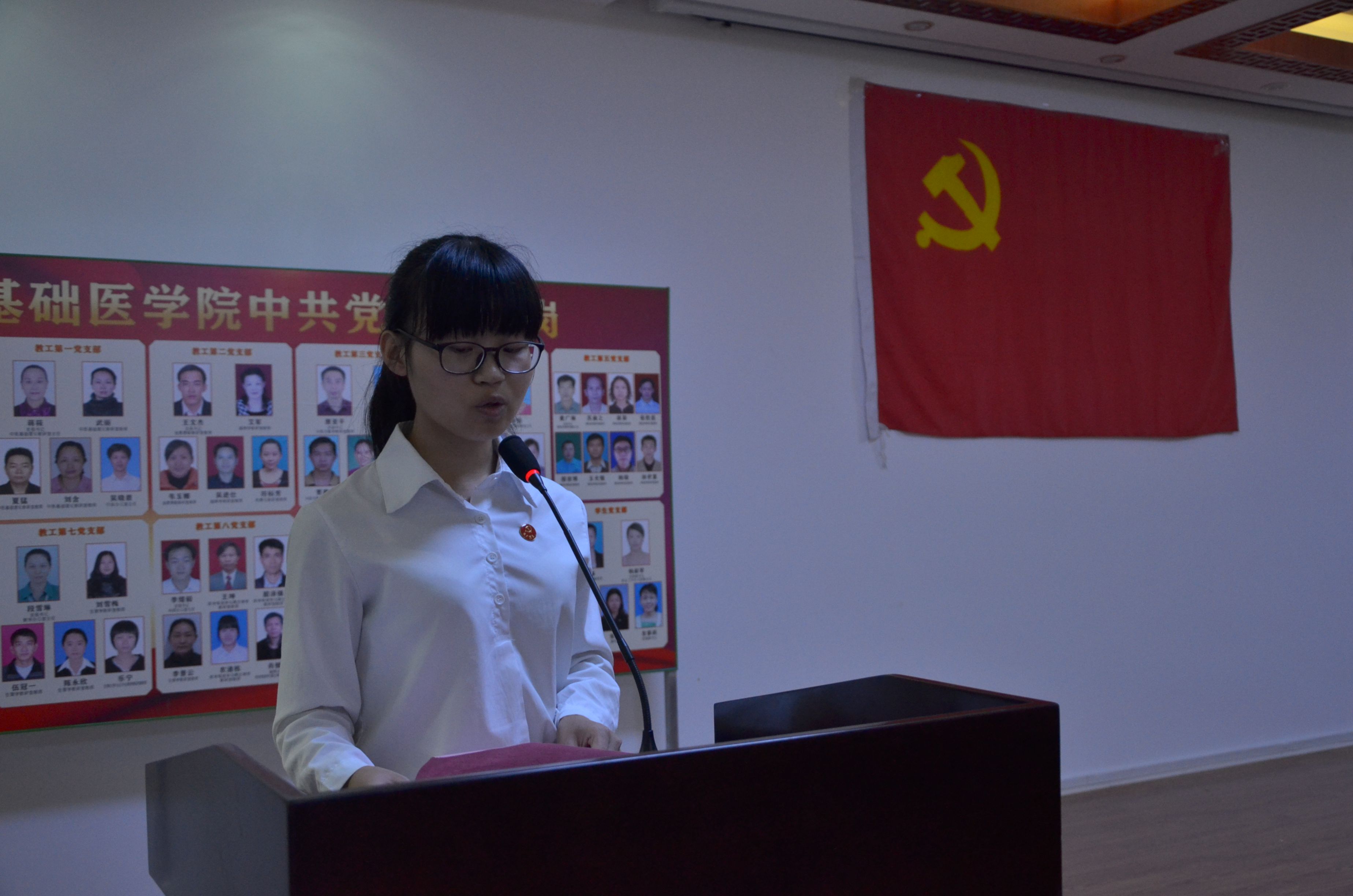 为热烈庆祝中国共产党建党95周年,为引导广大党员同志充分践行“两学一做”精神,激发广大大学生党员要勇敢面向未来,敢于挑战,不忘初心,做时代奋进者、开拓者和奉献者的信心,用实际行动为实现中华民族伟大复兴的中国梦共同打拼。基础医学院学生党支部在校党委、院党委的指导下,于2016年7月1日在基础医学院会议室召开“不忘初心,做时代奋进者”为主题入党宣誓大会。基础医学院党委副书记、副院长杨美春,基础医学院党委副书记龙春莉,基础医学院学生工作办公室老师杨丽琴、和卫宾、张锐以及学院全体党员参加本次大会。。