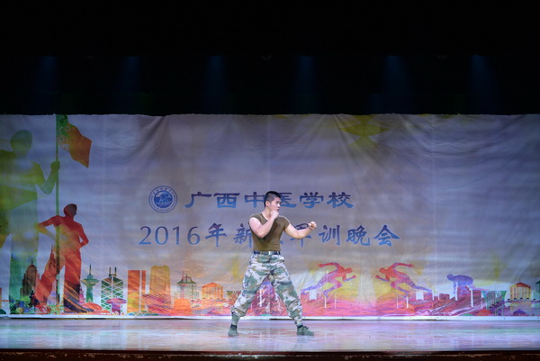 2016年9月3日晚上19:30分,广西中医学校2016年新生军训晚会在北湖校区大礼堂隆重举行。广西中医学校校长吴彬,副校长林原、黄勇、马秋平,校党委副书记罗艺徽,广西军区教导大队承训全体教官、班主任以及2016级新生参加了本次晚会。