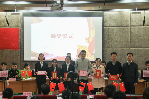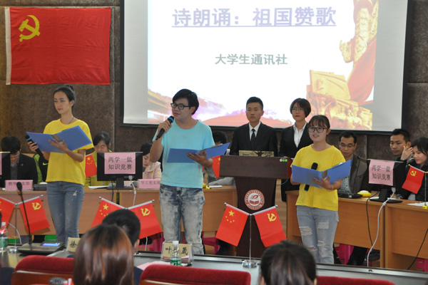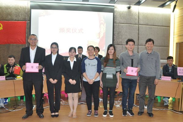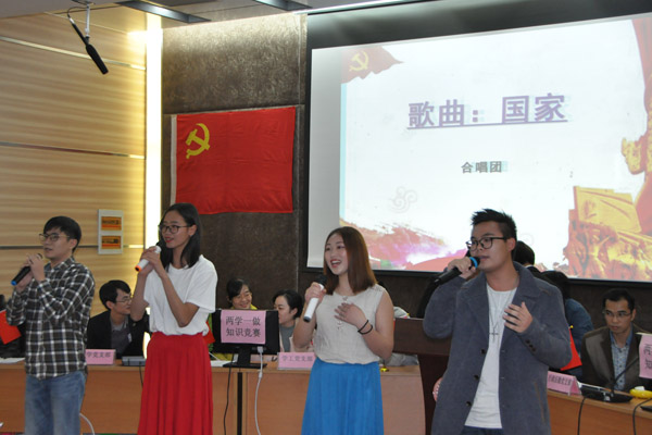 随后“两学一做”党的基本知识竞赛在大学生通讯社精心准备的诗朗诵《祖国赞歌》中正式拉开帷幕。各参赛队伍首先进行了突出部门特色,形式丰富多样的风采展示。接着,比赛的“必答题”、“选答题”及“抢答赛”三个环节逐次展开。同时为缓解现场紧张气氛,中间穿插了合唱曲目《国家》以及“你猜我答”活动。比赛现场气氛热烈,参与比赛的各支代表队的选手们在台上灵活应答、精彩频出。经过三轮比赛的激烈角逐,学工党支部2队与团学联党支部代表们凭借平日里对党的知识用心、深入地学习,在比赛中从容不迫、反应敏捷,勇夺教工组和学生组的冠军。比赛过程中,场下师生们反响热烈,他们在积极互动中也增进了自身对党的知识的理解。竞赛结束后,梁天坚副书记做了点评,肯定了各支部在开展“两学一做”学习教育过程中所取得的成效,也希望党员同志能好好吸收领会比赛中的相关知识点,在工作、学习与生活中真正做到知行合一。最后进行的是本次竞赛的颁奖仪式,学院领导分别为获奖队伍颁发了荣誉证书。