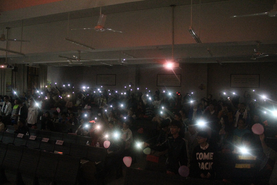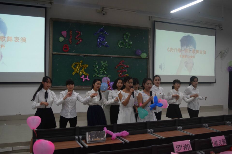 欢送会由2014级食品质量与安全班主要班干部组织,2015级、2016级食品专业类班级学生负责。整台晚会有相声、歌舞、朗诵、器乐等11个节目,所有节目均由食品系学生自编自演。其中,由获得广西国际标准舞全国公开赛一等奖的宋沁同学带领的环保时装秀展示了食品专业学子的自信与魅力,由2014级食科班选送的《外面的世界》诗朗诵合唱,将毕业生们面对求职受挫后仍坚强拼搏的精神展现的淋漓尽致。晚会最后,食品科学系吉他乐队用一曲张震岳的《再见》将晚会推向高潮。“我会牢牢记住你的脸,也会珍惜你给的思念”,这是温暖的食品一家人最后的道别。