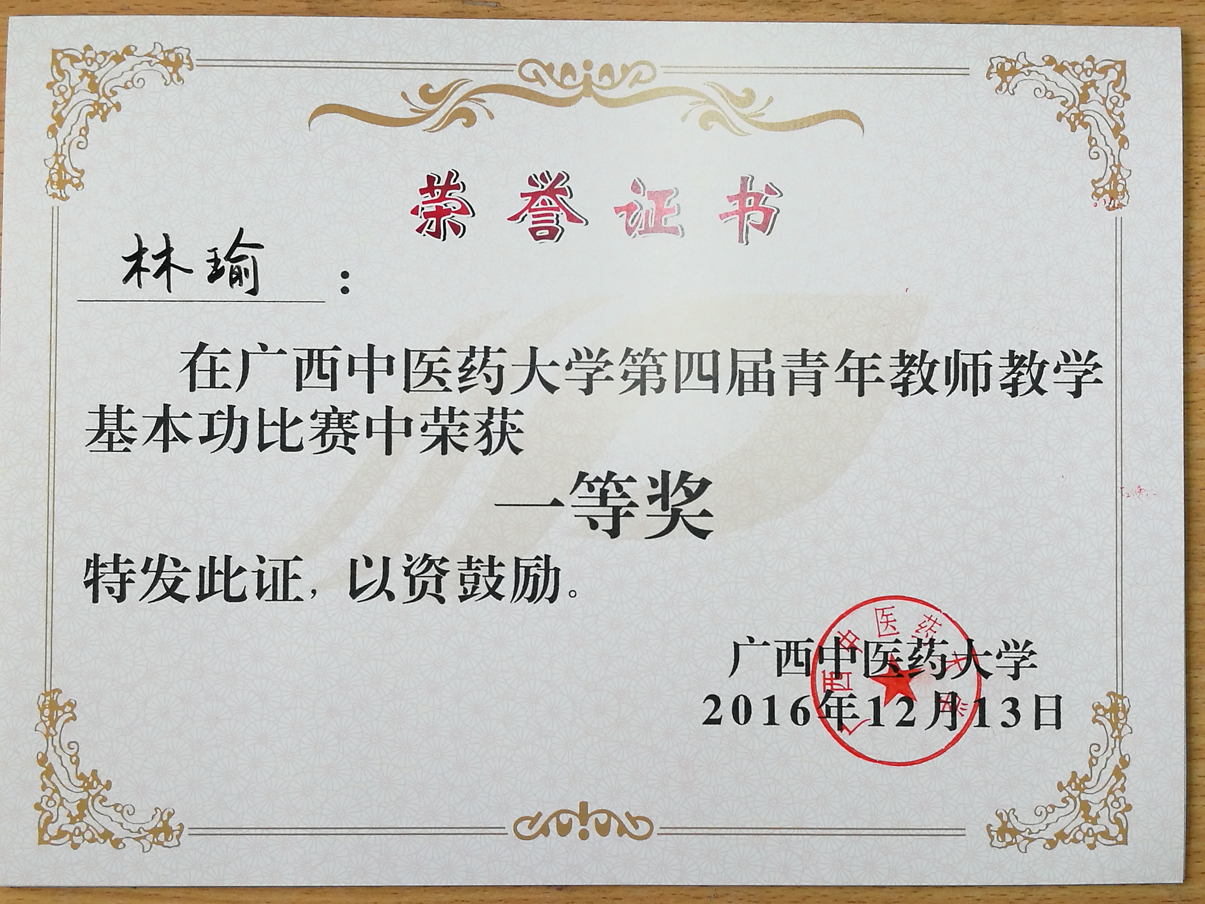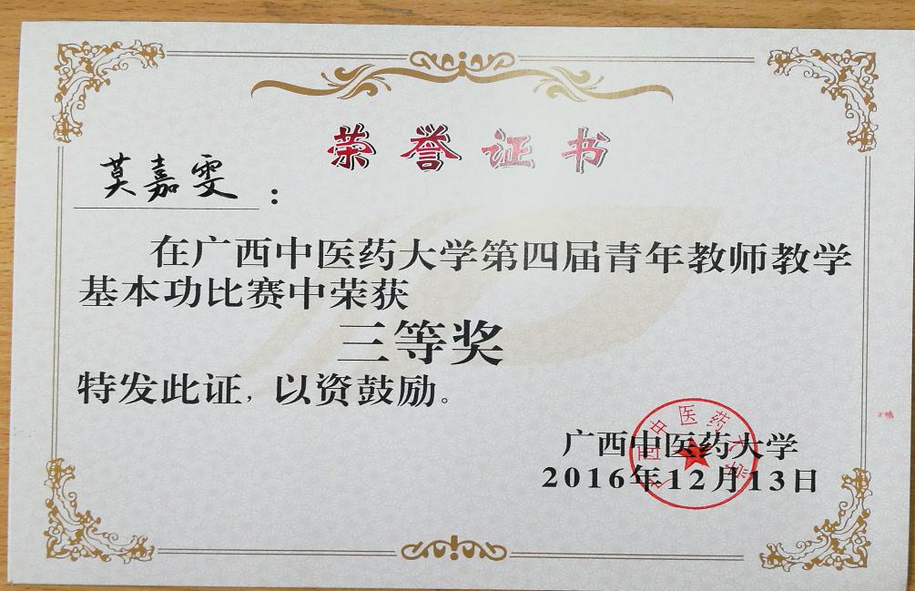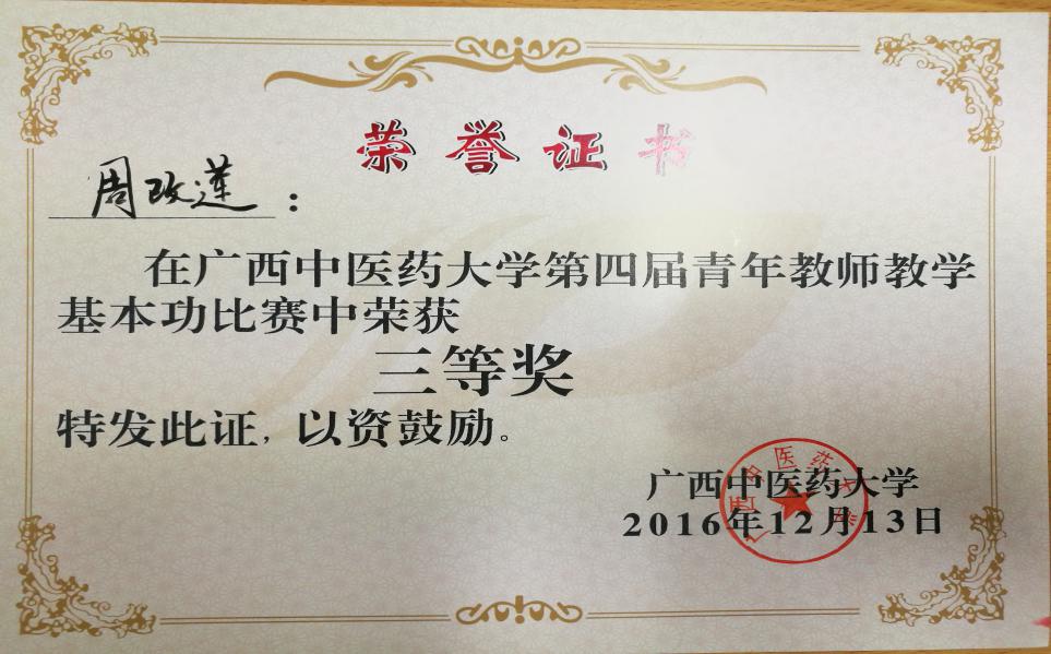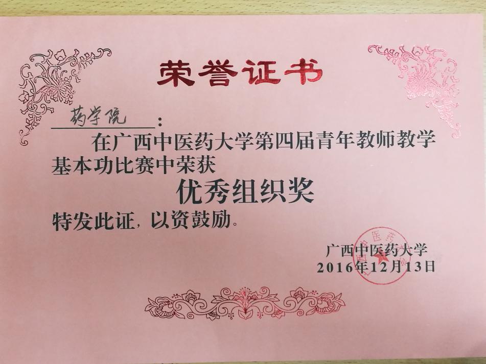 2016年12月13日,在仙葫校区1-310、1-315教室举行的taptap点点体育第四届青年教师教学基本功比赛中,药学院林瑜、周改莲、莫嘉雯、银胜高4位老师表现出色,林瑜老师获得一等奖、周改莲、莫嘉雯老师获三等奖、银胜高老师获优秀奖。林瑜老师获得最佳教学演示奖,周改莲老师获得最佳教学设计奖。药学院获得最佳组织奖。