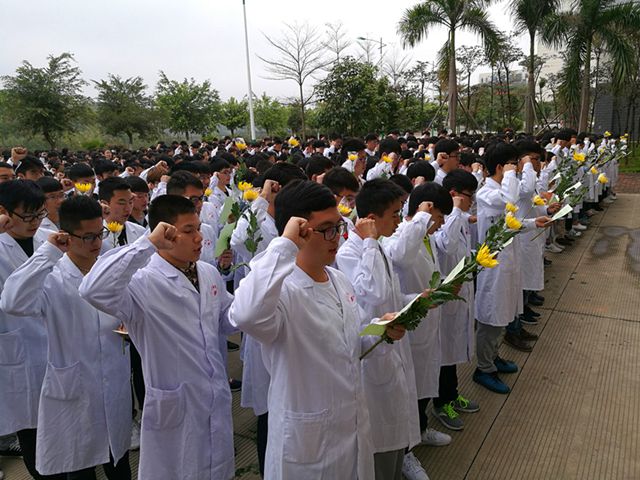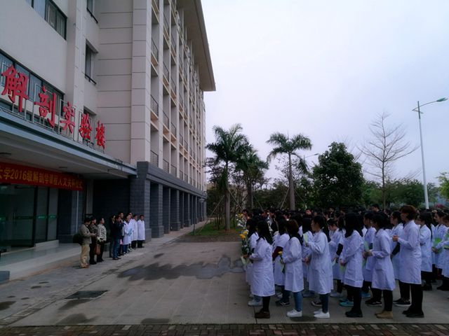 人体标本是医学生学习生涯中最特别的“老师”,他们虽然不能说话,但是却能教会同学们最重要的人体形态结构知识,然而在学生学成之时,“老师们”却听不到学生们由衷的感谢。为了在学生中倡导遗体捐献者们这种崇高的思想境界,感恩和缅怀逝者,基础医学院于2016年3月10日下午,在仙葫校区解剖学实验楼门前的小广场,举行了一个简短而神圣庄严的人体解剖学开课人文关怀仪式。在老师的带领下,300余名师生一起宣读誓词,大家怀着万分崇敬的心情缅怀和祭奠那些拥有无私奉献精神的遗体捐献者,并依次献上鲜花,行追思礼,表达尊重和感恩之情。教务处唐梅文处长,基础医学院林江院长、龙春莉副书记和夏猛副院长一起参加了仪式。