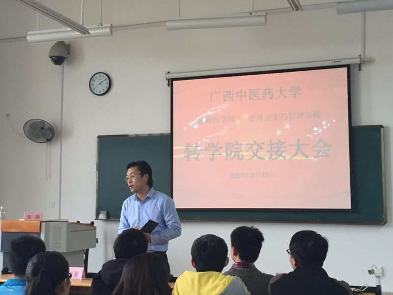 公共卫生与管理学院顺利完成预防医学专业学生转入交接 来源:公管学院 日期:2017-03-23 点击数: 次 分享到: 2017年3月22日下午,在仙葫校区1-211教室,我院和基础医学院顺利完成预防医学专业的转学院交接大会,该专业目前2016级的36位同学正式我院大家庭中的一员。 基础医学院党委副书记龙春丽老师、学生工作办公室主任杨丽琴老师、公共卫生与管理学院团委书记宋南老师出席了本次大会。 龙副书记讲话 宋老师介绍我院基本情况 打印正文 关闭本页