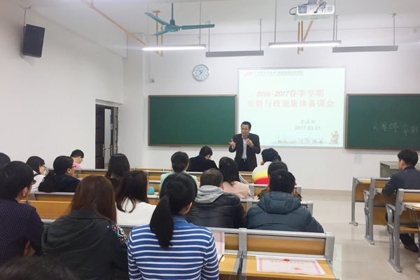 为巩固培训班学习成果,提高赛恩斯新医药学院《形势与政策》课程教学水平,3月21日上午,赛恩斯新医药学院思政部在自诚楼A207教室召开2016-2017年春季学期《形势与政策》集体备课会。学院党委副书记、副院长(正处级)冼锦华出席,《形势与政策》全体授课教师参加会议。会议由学生管理科副科长沈仰峰老师主持。