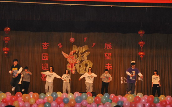 晚会上,吴彬校长致开幕辞,并带来新年祝福。一首喜气洋洋的开场舞《吉庆有鱼》拉开了帷幕,灯光璀璨的舞台上各种原生态的舞蹈、歌曲等共23个节目轮番上演。整个晚会笼罩着浓浓的节日气氛,高潮迭起、精彩纷呈。经过激烈角逐,来自09(8)班的《舞蹈狂想曲》获得了晚会的一等奖。