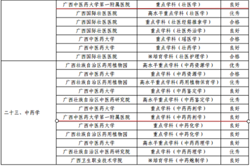近日,广西壮族自治区中医药管理局发布《自治区中医药局办公室关于广西中医药重点学科建设验收情况的通报》,2020年12月确定立项的90个学科建设点(包括12个高水平中医药重点学科)列入验收考核,合格以上共84个(优秀27个、良好30个、合格27个),占93%;不合格6个,占17%。