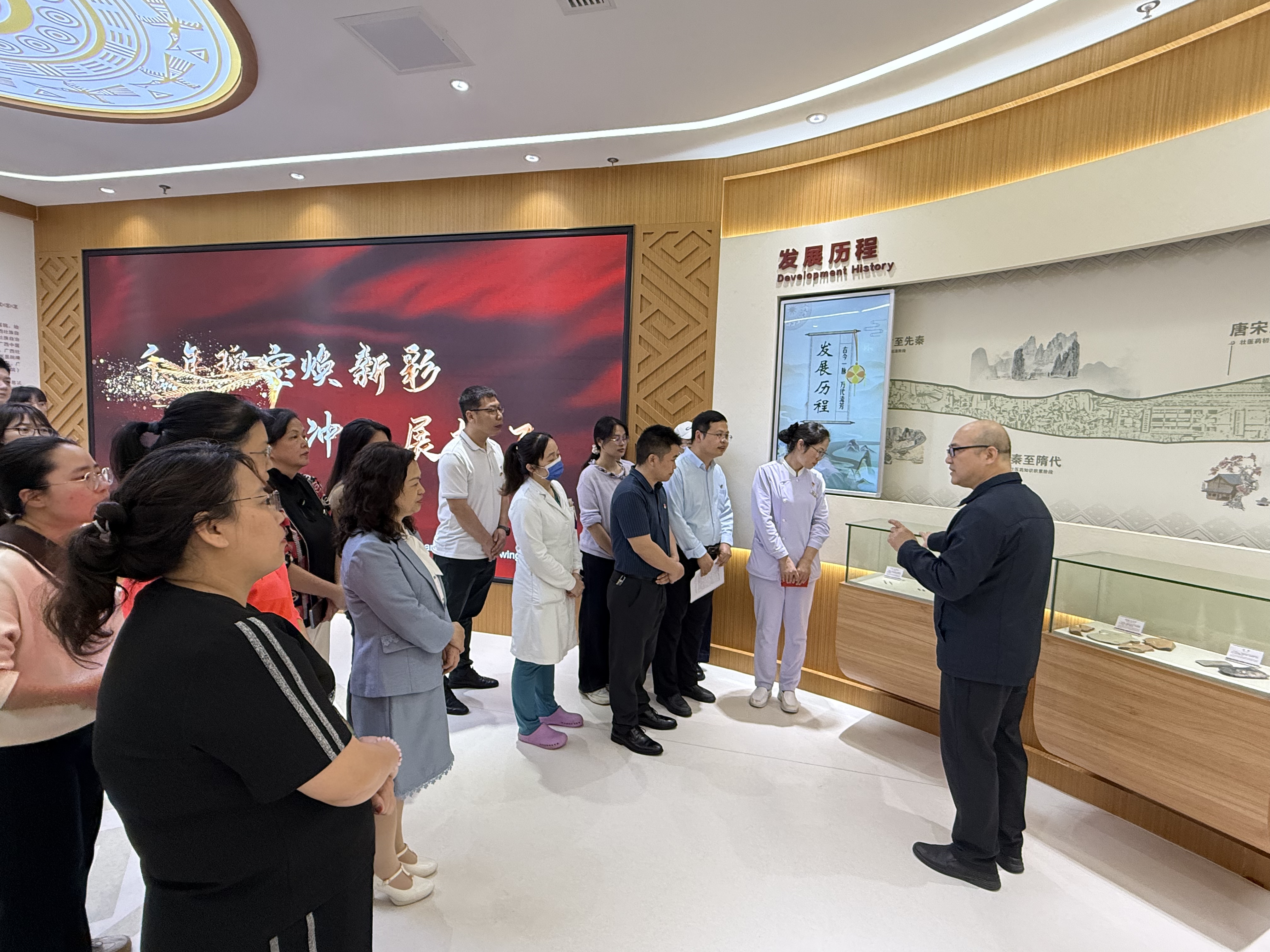 在参观过程中,吴光系统梳理了医院发展的各个重要历史节点,全面回顾了医院的发展历程、文化传承及取得的辉煌成就。他还深入讲解了壮医药的发展脉络及医院核心价值体系,通过生动细致的讲述,让大家深刻感受到壮医药的独特魅力,直观体会到医院一路走来的奋斗历程,进一步增强了党员职工的主人翁意识和责任担当。