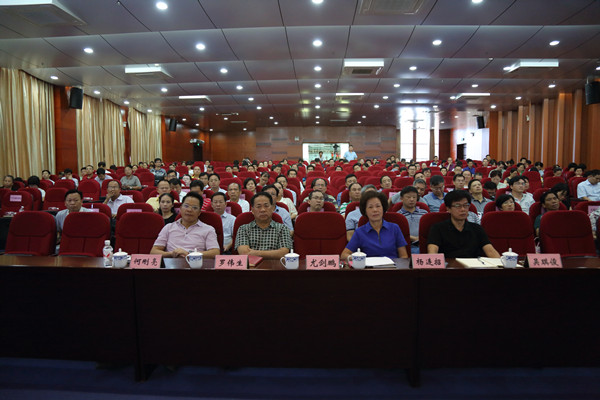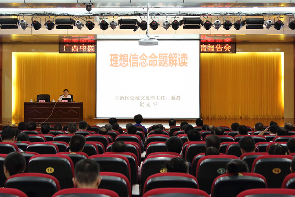 为庆祝建党95周年以及更好地践行“两学一做”精神,6月27日下午,学校组织党委理论学习中心组(扩大)集中学习“两学一做”的讲政治、有信念的专题教育党课,特邀自治区党校文史部主任贺先平教授为党员干部上了一堂主题为《理想信念命题解读》的专题教育。校党委副书记、纪委书记杨连招主持党课,学校副校长罗伟生、吴琪俊,总会计师何刚亮,学校党委委员、全校中层以上党员领导干部、党支部书记、学生党员代表和离退休党员代表聆听党课。