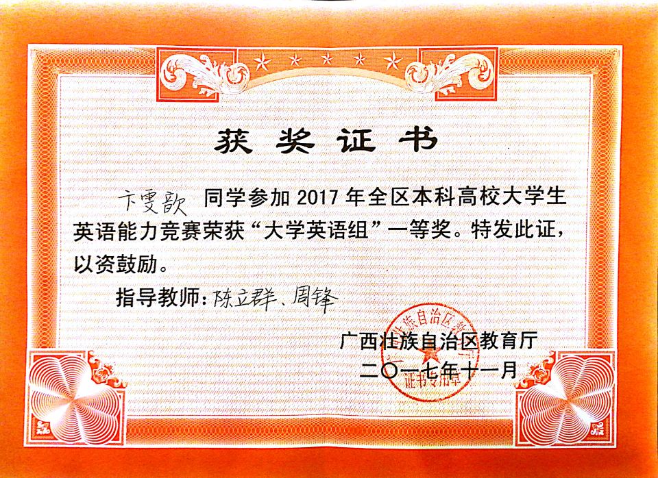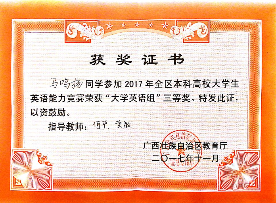 喜报:点点体育学生获得2017广西本科高校大学生英语能力竞赛一等奖