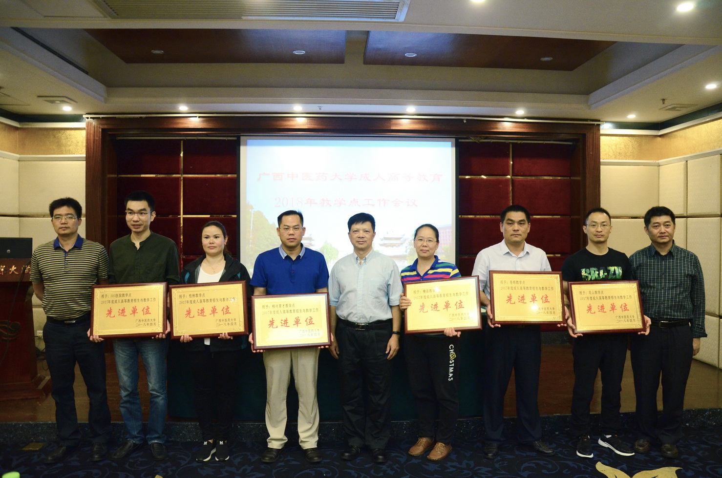 为表彰先进,树立模范,成教院副院长覃振林宣读表彰招生与教学优秀先进单位的决定,成教院领导班子对荣获2017年度先进单位的6个教学点颁发牌匾。