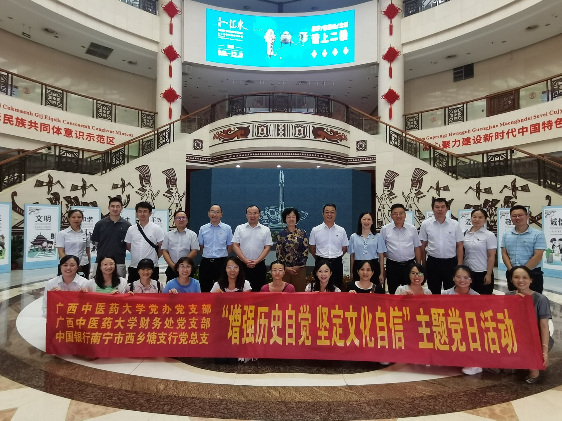 为弘扬中华优秀传统文化,激发党员爱国热情,9月23日下午,党办党支部、财务处党支部联合中国银行南宁市西乡塘支行党总支在广西民族博物馆开展“增强历史自觉 坚定文化自信”主题党日活动。学校原党委副书记、纪委书记杨连招以普通党员身份参加了活动。