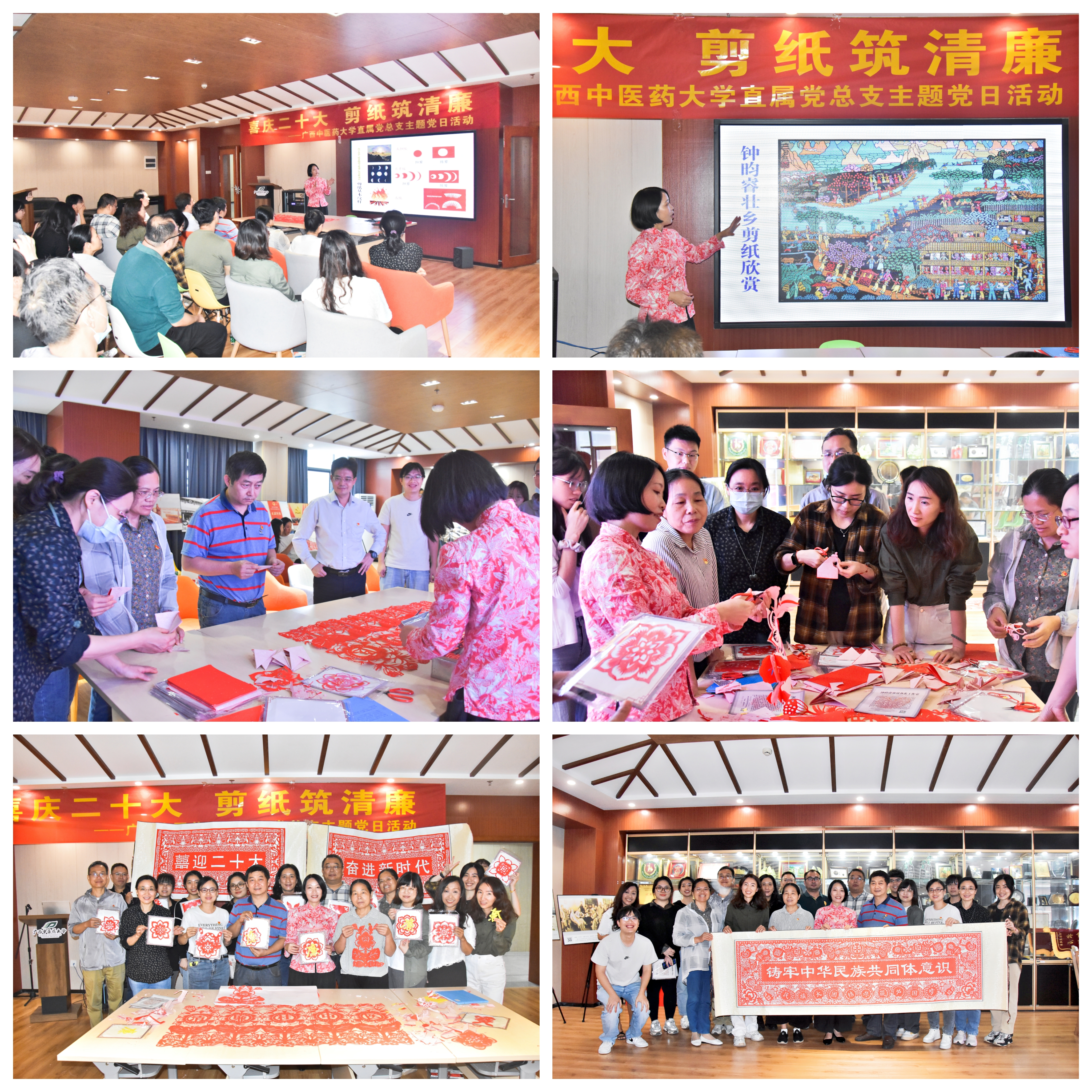 为深入学习宣传贯彻党的二十大精神,推进将“红色传奇”进行到底系列活动的开展,结合“清廉桂中医”主题将非遗文化引进校园,丰富主题党日活动形式,11月15日下午,直属党总支在国际教育学院310号展厅开展“喜庆二十大 剪纸筑清廉”主题党日活动,邀请广西工艺美术大师、南宁剪纸非物质文化遗产代表性传承人钟昀睿老师讲党史,传授剪纸技艺。直属党总支所辖各支部党员及干部参加了活动。