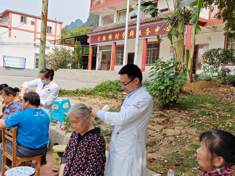 11日上午,邓家刚团队在恩城乡陆榜村卫生所开展惠民义诊活动。义诊现场,专家团队耐心接诊,为群众答疑解惑,提供专业的健康指导与疾病预防知识等服务。在特色技法体验区,壮医香灸疗法、壮医针灸、壮医筋经疗法等民族医特色技法深受群众喜爱。