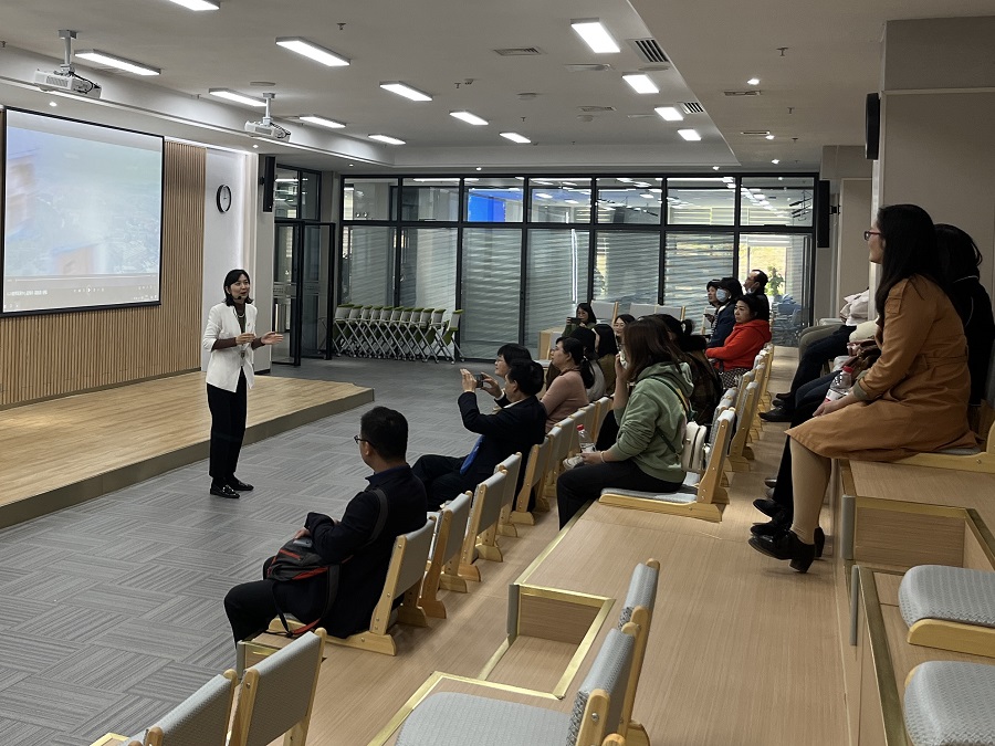 朱珠向广西农业职业技术大学来访团详细介绍了教师教学发展中心的组织机构、人员配置、工作职能 及取得成效,并陪同参观了1415m2教师教学发展中心新场地,就场地的功能分区、设计意图及场地赋能教育教学工作的重要作用与来访人员进行了深入沟通。