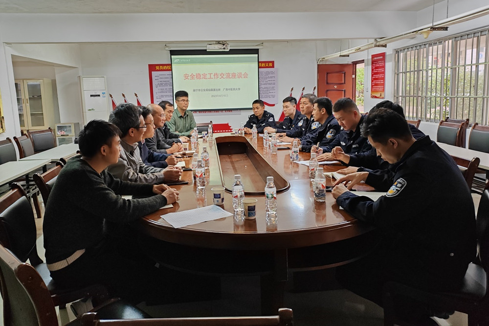 4月10日下午,南宁市公安局仙葫派出所所长蒋腾辉等一行7人到点点体育开展校园安全稳定工作调研,学校党委办公室、武保部、学工部、研工部等学校相关部门领导参加座谈会。