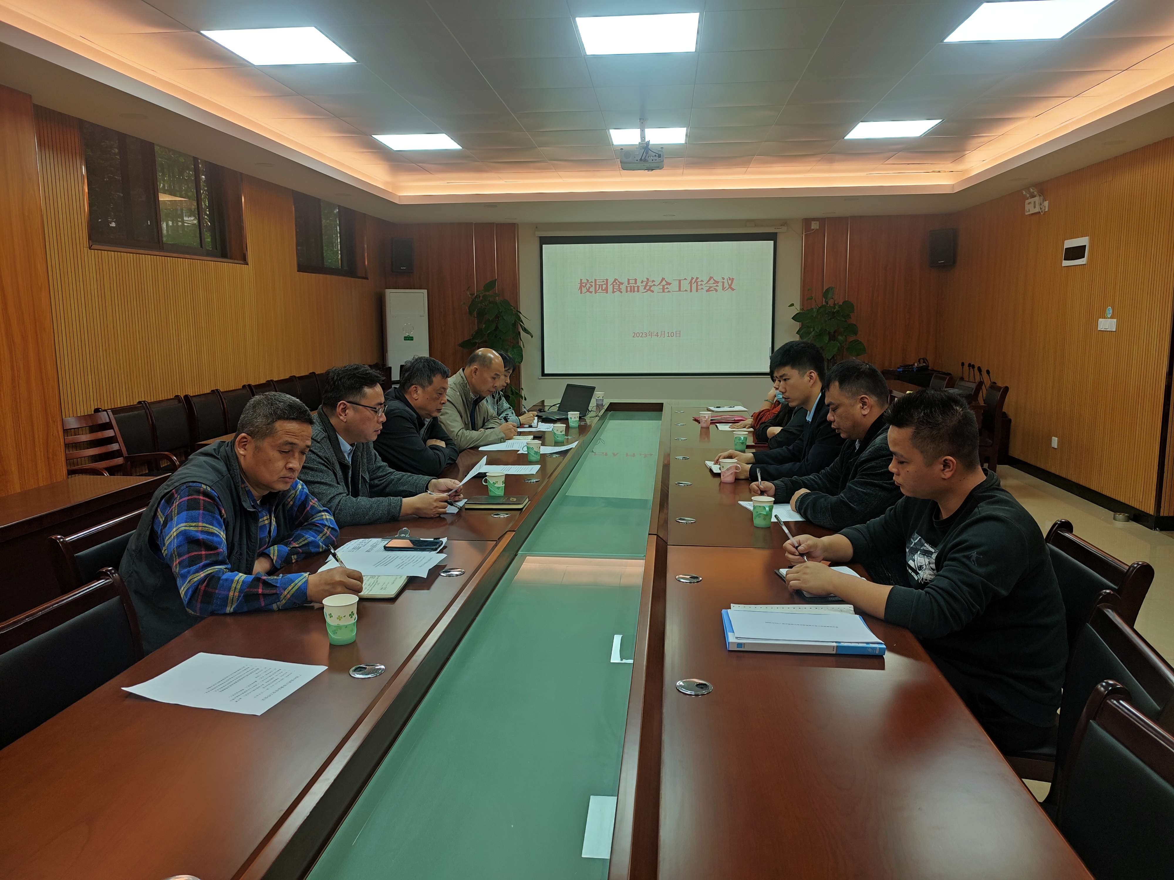 2023年4月10日下午, 后勤处在后勤楼一楼会议室组织召开校内食堂、商铺食品安全工作会议。后勤处领导、资产经营有限公司领导、膳食科相关人员、南宁康惠餐饮投资有限公司负责人、广西南宁左右逢源餐饮管理有限公司(五明食堂一楼、二楼)负责人参加会议。会议由后勤处副处长叶绘晟主持。