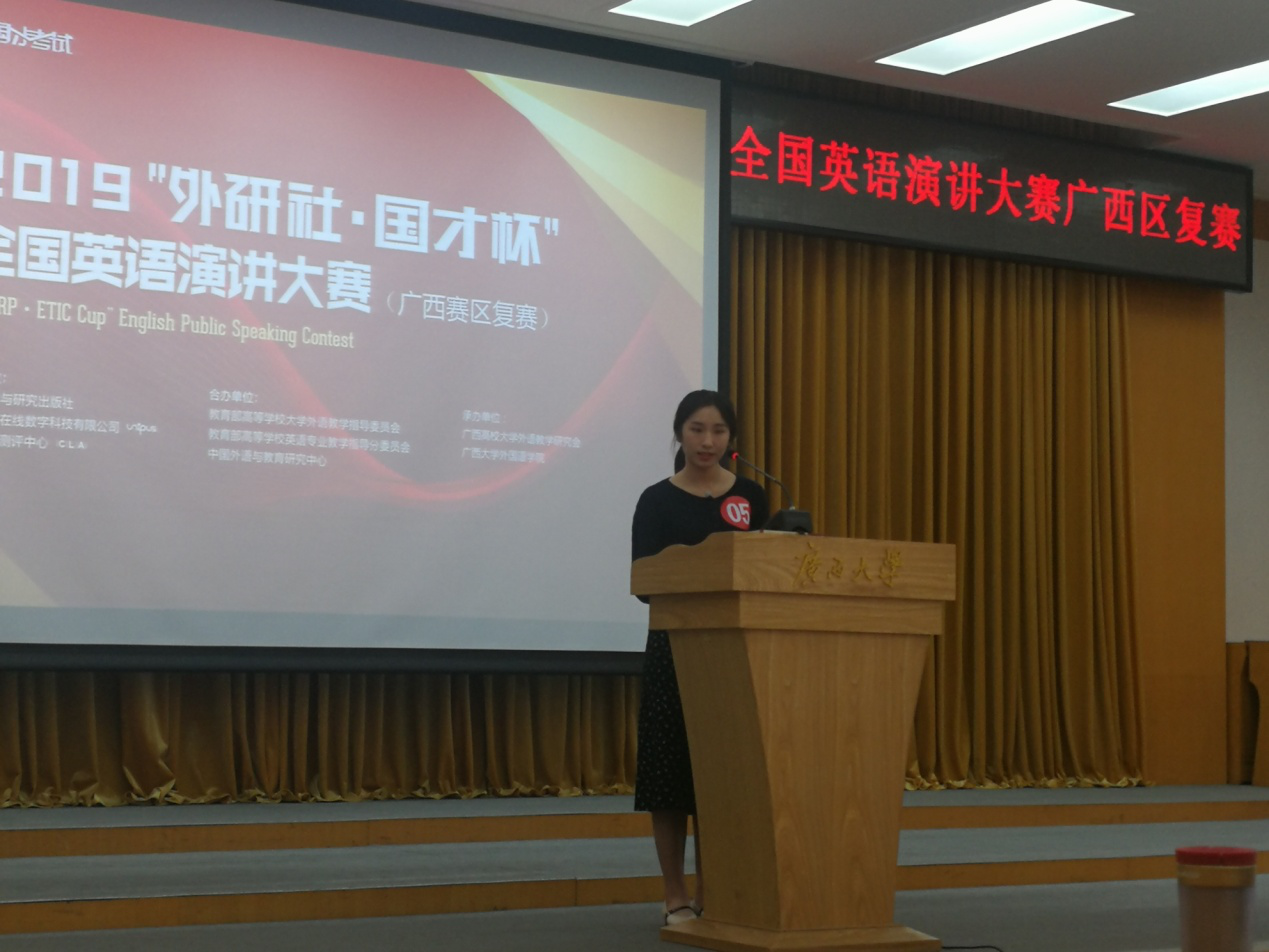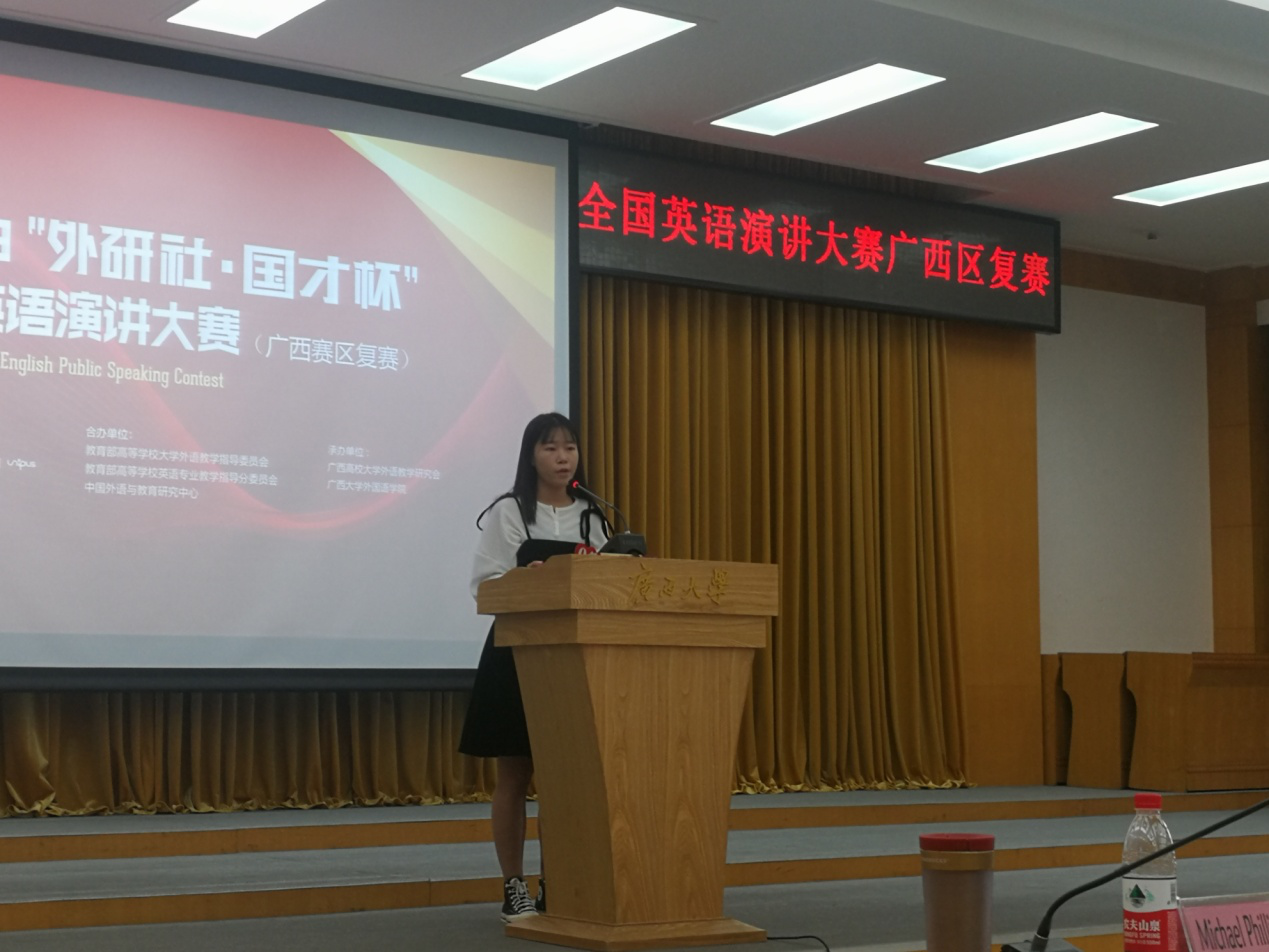 “外研社杯”演讲比赛由外语教学与研究出版社主办、教育部高等学校大学外语教学指导委员会与教育部高等学校英语专业教学指导分委员会合办,是国内水平最高,学术性最强的全国性大学生英语演讲赛事。此次广西决赛在广西大学举行,共吸引了来自不同专业学生100多位选手参赛。