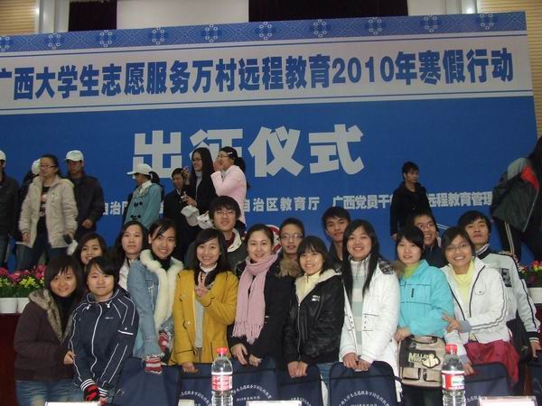 1月24日“广西大学生志愿服务万村远程教育2010年寒假行动出征仪式”在广西远程教育大厦隆重举行。此次由共青团广西区委、自治区教育厅、自治区远程办主办的大学生志愿服务,为农村党员干部现代远程教育工作提供了人才保障和智力支持,进一步扩大了大学生参与社会实践活动的覆盖面。