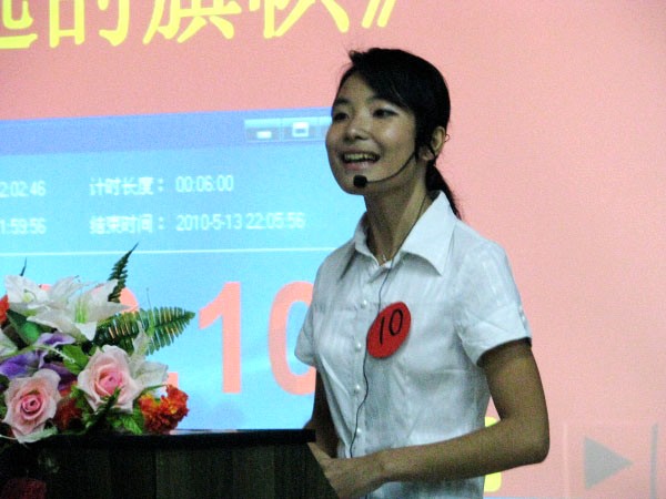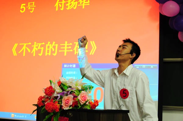 此次比赛分为脱稿演讲、即兴模仿演讲、现场答题等3个环节。评委从主题内容、语言表达、礼仪形象及综合印象等方面进行打分。05号选手付扬华慷慨激昂、抑扬顿挫的演讲引发了全场比赛的高潮。