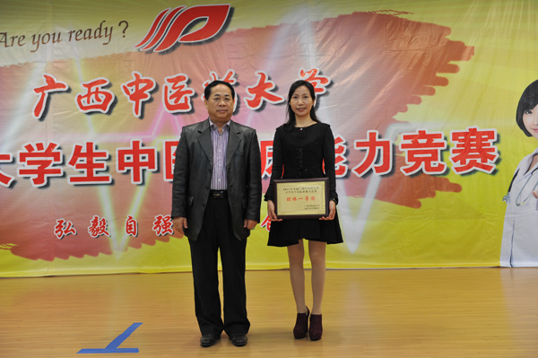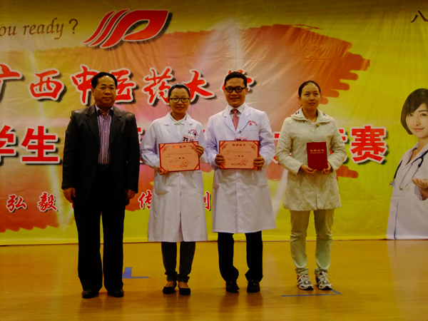 罗伟生副校长为一等奖选手颁奖(左二、三为瑞康临床医学院选手陈安静、唐成)
