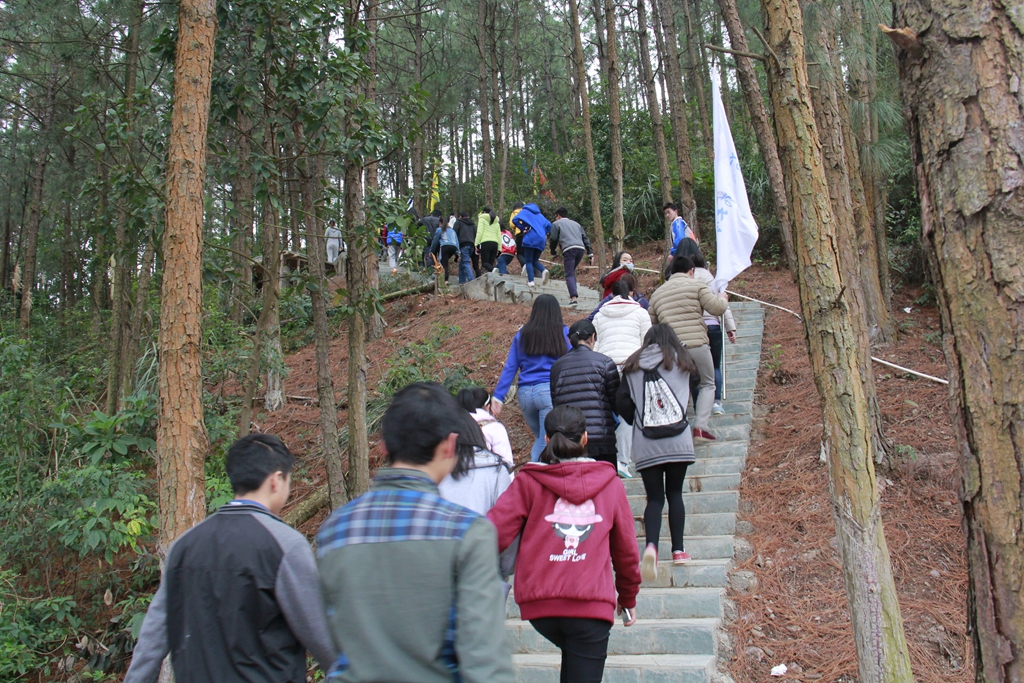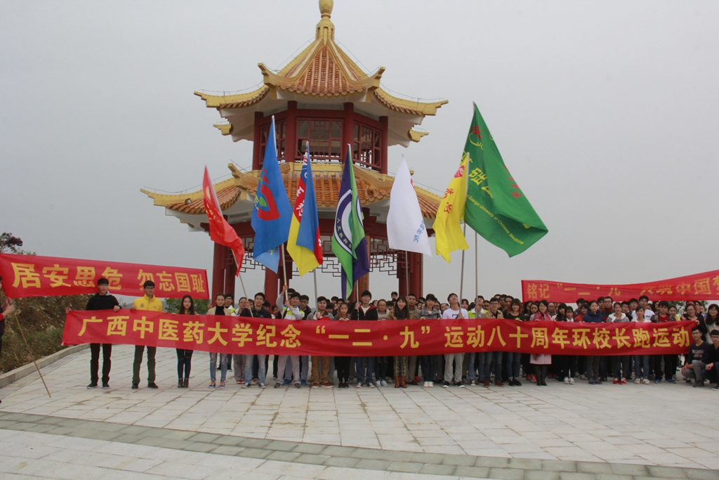 环校长跑开始后,同学们士气高涨,高喊“居安思危,勿忘国耻!”的口号,匀速跑上“亲亲路”,迎面刮起的寒风无法吹灭同学们心中的热情和迎难而上的决心。各学院代表挥舞着本院院旗,满怀自豪地奔跑着,队伍很快跑到药师山下,同学们变换队形有序登上神农阁。站在神农阁广场前,仙葫校区全景、美丽邕江一览无余,颇有“会当凌绝顶,一览众山小”之感。经过坚持不懈地奋力奔跑后领略到如梦美景,同学们都不禁觉得身心舒畅,沉醉其中。