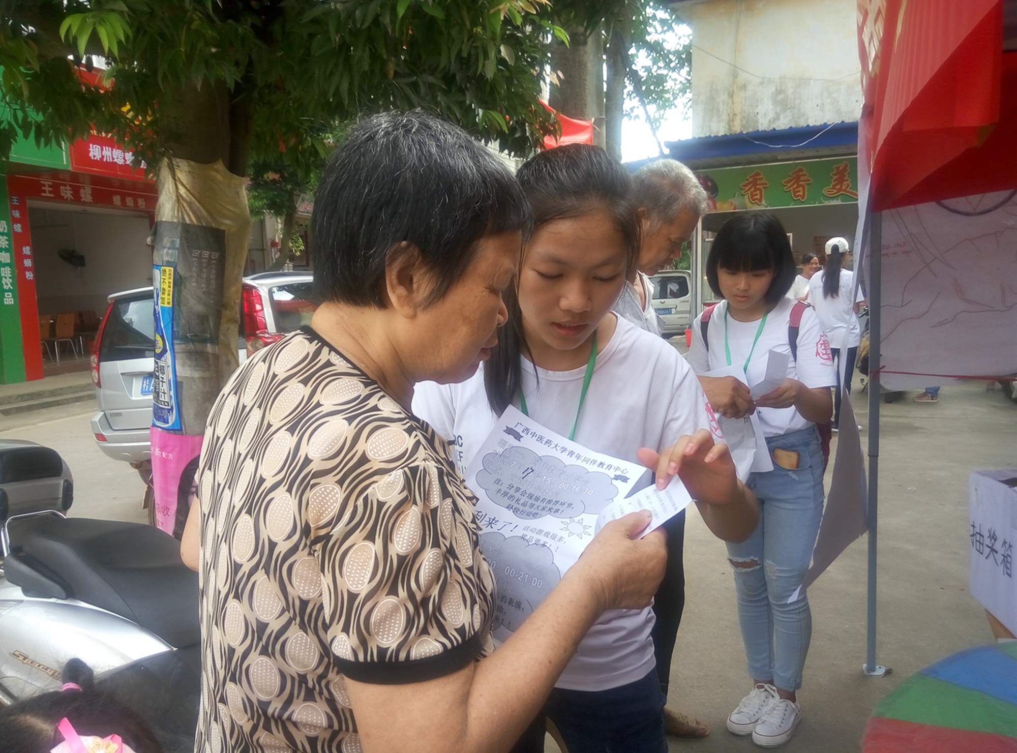 2016年7月14日至7月16日,针灸推拿学院联合人文社科学院赴罗城县、大化县开展暑期社会实践义诊与健康调查活动。针推学院潘立老师、人文学院宋南老师和渠淑洁老师参加了此次活动。7月15日上午,实践团队在罗城大广场开展义诊和健康调查活动。针推学院主要负责义诊活动,志愿者们为居民进行艾灸、手法按摩和量血压等志愿服务。人文社科学院主要对前来参加义诊的群众进行健康知识的调查,两个学院相互配合共同合作,吸引了很多的群众前来咨询与体验。