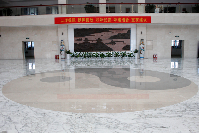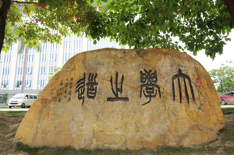 二楼大堂的地面上铺设有太极阴阳鱼图案,墙上是一幅由晨钟暮鼓楼校门及邕江组成的壁画,联曰:“月明风清更有半江渔火引目去,日曦气紫且迎一天云霞扑面来”。道出了位于邕江之畔的仙葫校区,依山傍水,环境优雅,在这里源远流长的华夏文化与博大精深的中医文化融为一体,很好地体现出学校的办学理念和校园文化特色,正是潜心学习和兴办大学的绝佳场所。