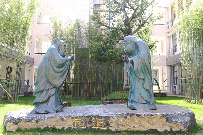 大型青铜雕塑作品《问道》位于仙葫校区教学楼西侧。该作品由广西美协主席、我国著名雕塑家石向东教授及其团队创作。《问道》匠心独运地表现了老子、孔子两位中国先圣会晤的形象。