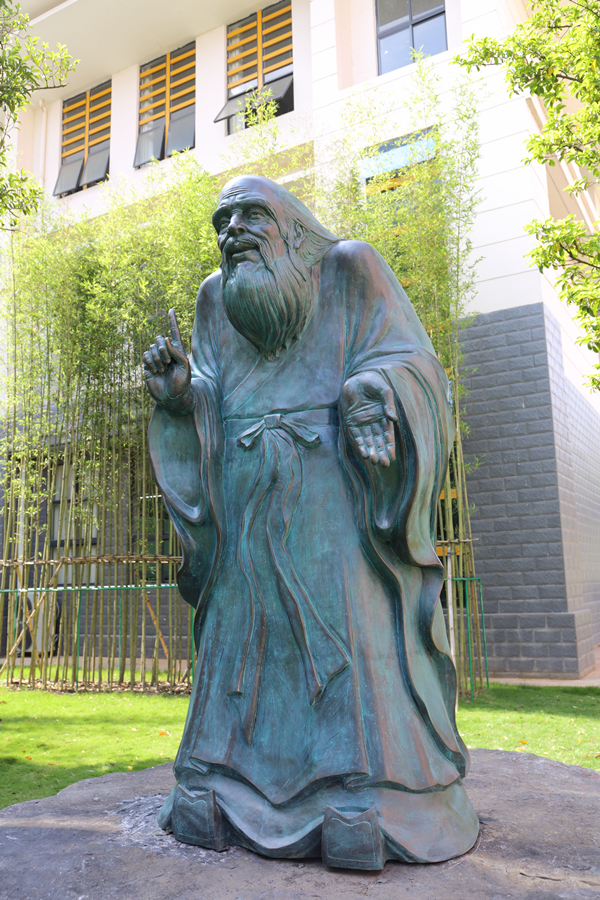 《问道》主题雕塑重现了“孔子问道于老子”求知若渴,不懈追求的一幕。《问道》中的孔子打拱作揖,弥散着礼敬与谦和,展现出儒家仁礼、仁爱为本的道德追求;老子则造型奇崛,神采飘逸,体现出道家道法自然、虚怀若谷的希夷气象。《问道》雕塑形神兼备,栩栩如生,佐以周围绿竹猗猗,春阳朗照,化现出中华传统文化天人合一、礼用和贵的至高境界。